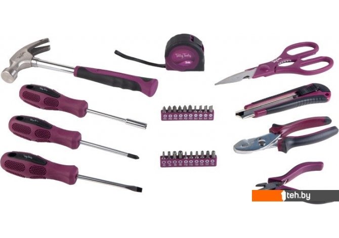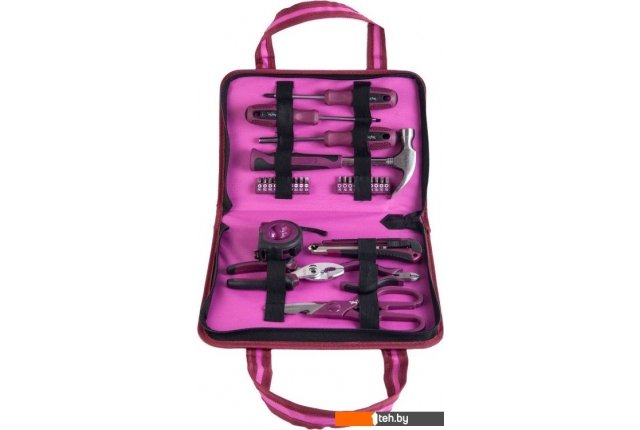| Комплектация | биты 1/4" 20 шт., рукоятка-битодержатель 205 мм, рулетка 3м?16мм, нож канцелярский 160 мм, плоскогубцы 160 мм, молоток гвоздодер 240 мм, отвертки (SL5.5?100, PH2?100), кусачки 110 мм, ножницы 210 мм, сумка |