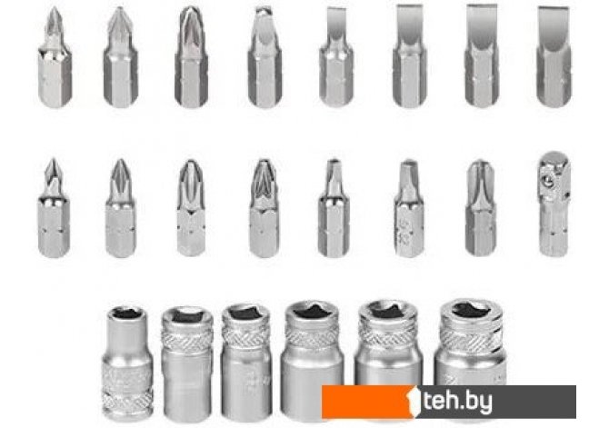 | Комплектация | Биты 25 мм • Torx: T8, T10, T15, T20, T25, T27, T30, T35, T40 • Крестовые: PH1, PH2 • С прорезями: 5, 6 мм; • Магнитные головки: 4, 6, 8, 10 мм • 3шт биты Torx: 6, 8, 10 мм • Трехкрылые биты: 1, 2, 3, 4 мм • Шестигранные биты: 2, 2.5, 3, 4, 5, 6 мм |