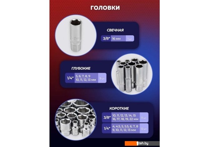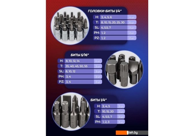 | Комплектация | Посадочный квадрат1/4": Головки: 4, 4.5, 5, 5.5, 6, 7, 8, 9, 10, 11, 12, 13 мм Головки глубокие: 5, 6, 7,8, 9, 10, 11, 12,13 мм Битодержатель: 1/4(F)?1/4(M) Головки биты: H: 3,4,5, 6; T: 8, 10, 15, 20, 25, 30; SL:4, 5.5, 7 PH: 1, 2 PZ:1,2 Биты: H 3, 4, 5; T: 10, 15, 20; SL: 4, 5.5,7; PH:1, 2, 3. Адаптер под шуруповерт Рукоятка для головок Трещотка реверсивная Вороток Т-образный Гибкий удлинитель Кардан шарнирный Удлинители: L-50, L-100 мм Посадочный квадрат 3/8": Биты 5/16": H: 8, 10, 12, 14: T: 35, 40, 45, 50, 55; SL: 8, 10, 12; PH: 3, 4; PZ:3, 4. Головки: 10, 11, 12, 13, 14, 15, 16, 17, 18, 19, 22 мм Головка свечная 16 мм Трещотка реверсивная Кардан шарнирный Удлинитель L-125 мм Битодержатель: 3/8(F)+5/16(M) Ключи Г-образные шестигранные: 1.5, 2, 2.5 мм Кейс |