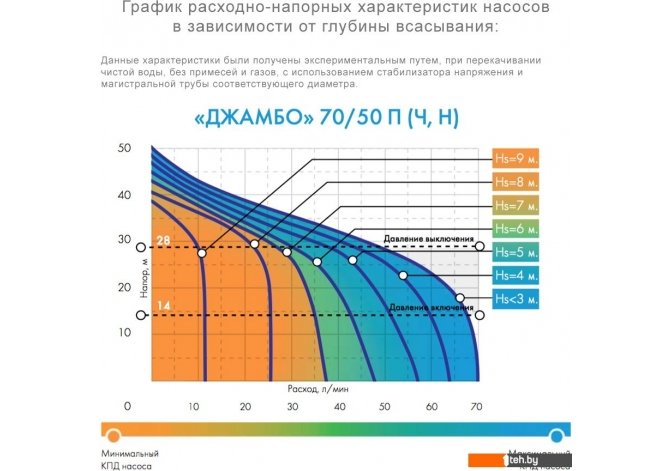 | Информация | Насосная станция Джилекс Джамбо 70/50 Ч-24 состоит из насоса и горизонтального гидроаккумулятора объемом 24 литра, реле давления, манометра, соединительной арматуры и электрокабеля с вилкой. Имеет производительность 4,2 м3 в час и напор 50 метров, корпус насоса выполнен из чугуна, а гидроаккумулятор из углеродистой стали. Используется для создания комфортных условий пользования водой при пониженном давлении в трубопроводе. В управлении работой насоса применяется реле давления РДМ-5, которое позволяет насосной станции автоматически включаться и выключаться по давлению воды. Насосная станция предназначена для подачи чистой воды из колодцев, скважин, открытых водоемов, резервуаров, а так же для повышения давления в магистральных сетях. Позволяет организовать автоматизированное водоснабжение, или же создать комфортные условия использования водоснабжения при пониженном давлении в трубопроводе. Примечание "Джамбо" - серия насоса Первая цифра (70) - максимальный расход литров в минуту. Вторая цифра (50) - максимальный напор в метрах. Буквы "Ч" в обозначении - означает, что он изготовлен из чугуна; "П" из пластика; "Н" из нержавеющей стали. Цифра (24) - наличие и объем гидроаккумулятора. Буква "Н" после цифры - гидроаккумулятор изготовлен из нержавеющей стали. Без буквенного обозначения - изготовлен из углеродистой стали. Технические особенности насосной станции Джилекс Джамбо 70/50 Ч-24: Благодаря реле давления, насос работает в автоматическом режиме, управляется по давлению воды. Глубина всасывания достигает 9 метров - это обеспечивается благодаря встроенному эжектору; Гидроаккмулятор (у данной модели он объемом 24 литра) – смягчает гидроудар в момент пуска насоса и увеличивает ресурс насоса; Простой ввод в эксплуатацию, благодаря удобным заливным и сливным отверстиям; Хорошие условия всасывания на входе в насос и высокое давление на выходе - это обеспечено благодаря встроенному эжектору с системой труб "Вентури"; Возможность непрерывной работы - достигнуто благодаря конструкции с принудительным охлаждением двигателя. Подбор насосной станции Насосная станция подбирается исходя из требований по производительности насоса, а так же расстояний: от источника до насоса и от насоса до точки водоразбора. Полученные данные накладываются на график расходно-напорных характеристик. Обращаем Ваше внимание на то, что бы обеспечить долгую полноценную работу насосной станции, ее необходимо правильно подобрать. О правильном подборе Вы можете более подробно прочитать в статье или обратиться к нашим специалистам по телефону. Ограничения, касающиеся всей линейки насосных станций Джилекс Джамбо: Не допускается заужение всасывающей магистрали, менее чем 25 мм (внутренний диаметр); Насосная станция серии Джамбо не поднимает воду с глубины более 9 метров; Не допускается работа насоса без воды или без расхода воды "в тупик"; Не допускается попадание воздуха во всасывающую магистраль; Необходимо устанавливать обратный клапан в самой нижней точке трубопровода при заборе воды из колодца или скважины, а при подключении к магистральному трубопроводу - перед входным штуцером насоса на всасывающей магистрали; В случае нестабильного напряжения в сети, необходимо устанавливать стабилизатор напряжения. |