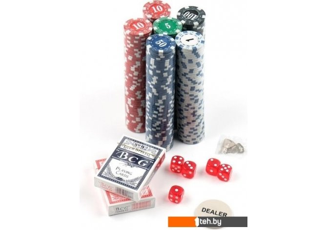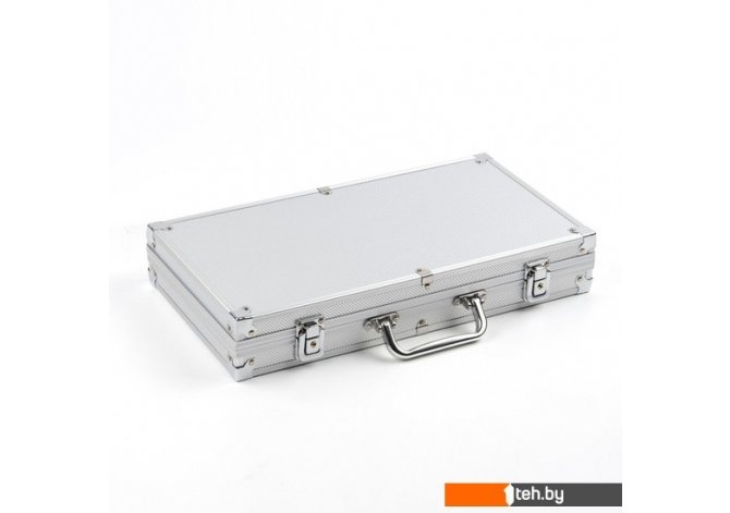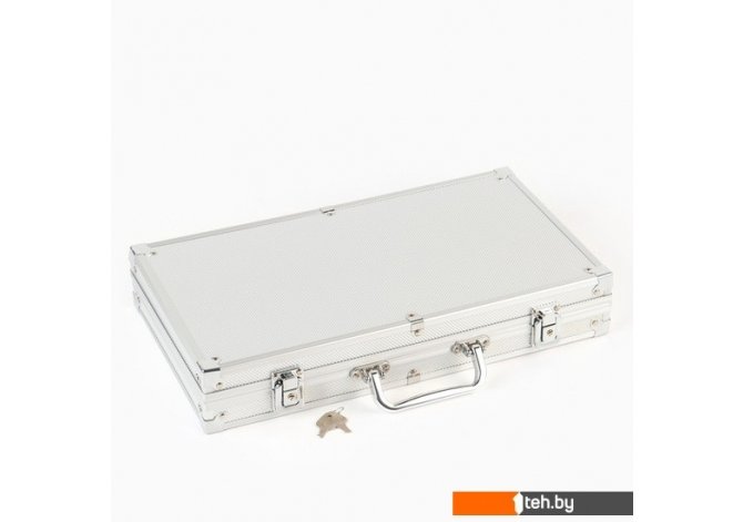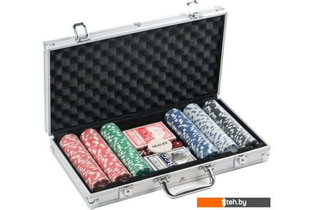 | Комплектация | - металлический кейс; - 2 колоды бумажных карт (54 шт.); - 300 фишек с номиналом; - фишка дилера; - 5 кубиков. |
