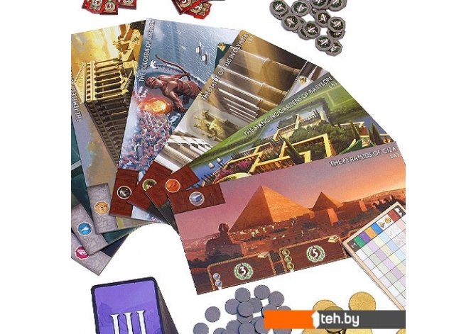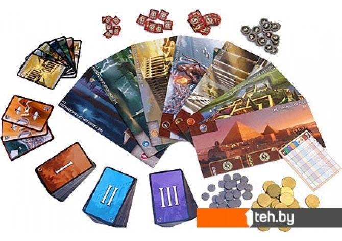 | Комплектация | - 7 индивидуальных полей Чудес света- 7 карт Чудес света- 49 карт первой Эпохи- 49 карт второй Эпохи- 50 карт третьей Эпохи- 42 жетона конфликтов- 20 монет номиналом 3- 30 монет номиналом 1- 2 карты для игры вдвоём- правила подсчета очков- правила игры на русском языке отдельно (Стиль Жизни)- коробка |