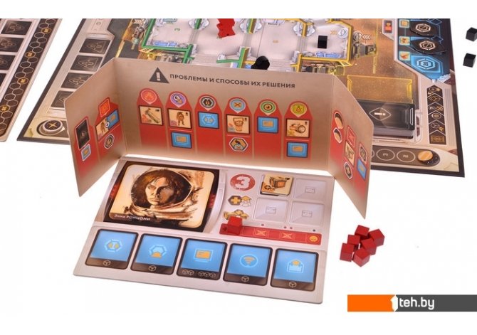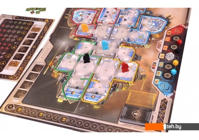 | Комплектация | — 1 игровое поле. — 1 консоль АДЕЛЬ. — 4 планшета персонажей. — 4 ширмы персонажей. — 27 карт АДЕЛЬ — 25 карт событий. — 28 деревянных кубиков. — 4 фигурки игроков. — 4 шестигранных кубика. — 1 двадцатигранный кубик. — 1 деревянный цилиндр энергии. — 147 жетонов, фишек и маркеров. — 1 мешочек. — 1 памятка. — Правила. |