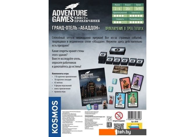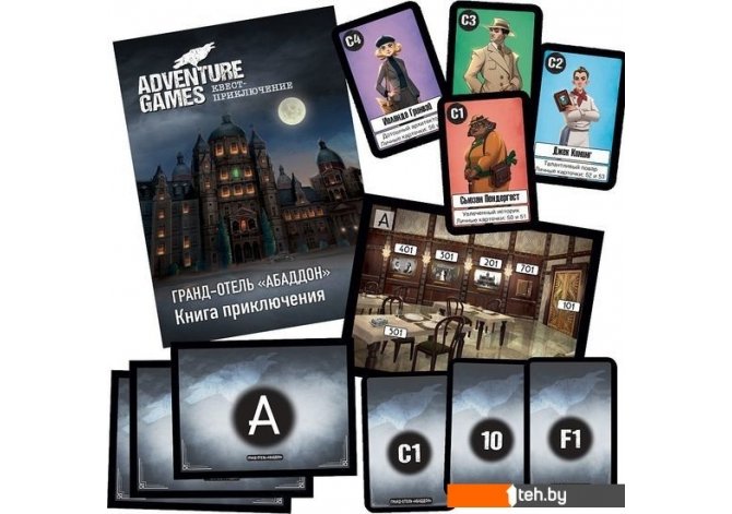 | Информация | Игрокам предстоит стать командой бесстрашных исследователей и погрузиться в мистические и леденящие душу события в старинном отеле «Абаддон». Кооперативная игра состоящая из 3 глав. Словно в классических компьютерных квестах, игроки будут исследовать локации, находить и комбинировать предметы, а также решать головоломки и взаимодействовать с персонажами. Комплектация: Карточки приключения — 110 шт. Карточки локаций — 18 шт. Фишки персонажей — 4 шт. Жетоны — 43 шт. Книга приключения. Правила. |