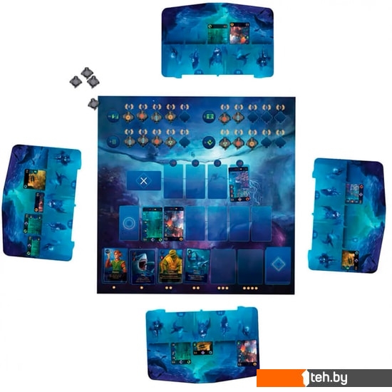 Комплектация | Игровое поле4 трёхслойных планшета игроков (размер слота под карты - 52мм)16 пластиковых миниатюр ручных скатов23 пластиковые миниатюры диких скатов56 карт акваторий (50х88 мм)8 карт морских королей (63х88 мм)24 карты стартовых персонажей (по 6 на 4 игроков, 63х88 мм)18 карт персонажей Океана (63х88 мм)5 двусторонних жетонов игровых целейКнига правил |