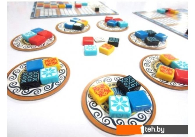 | Комплектация | Диски складов – 9 шт.Плитки – 100 шт.Планшеты игроков – 4 шт.Мешок – 1 шт.Фишки победных очков – 4 шт.Фишка первого игрока – 1 шт.Правила игры – 1 шт. |