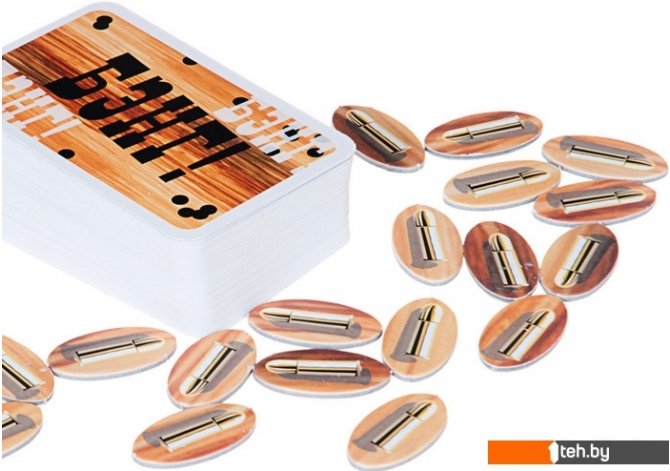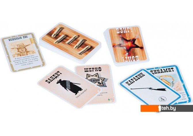 | Комплектация | - 7 карт ролей- 16 карт персонажей- 80 игровых карт- 7 памяток- 7 планшетов- 30 жетонов патронов- правила игры |