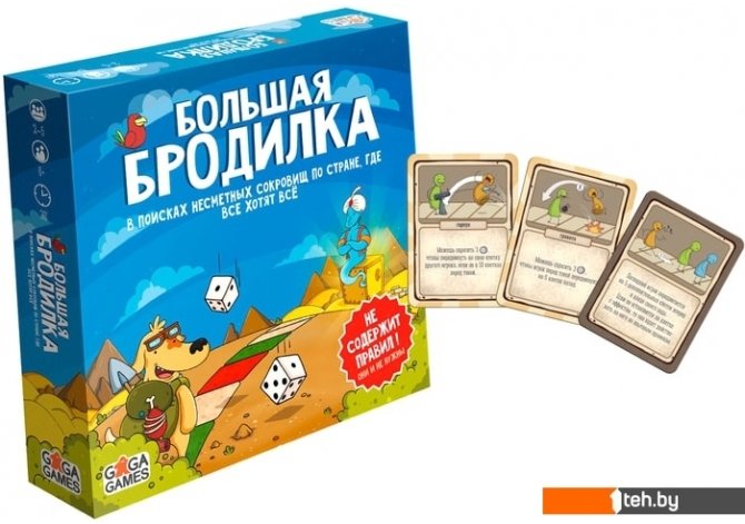 | Информация | Большая Бродилка — игра для тех, кто устал от сложных правил и соскучился по любимому с детства развлечению. Она проста, как два кубика, и увлекательна, как путешествия во времени. Или как коробка шоколадных конфет: начнешь — и уже не остановиться.Большая Бродилка: чуть больше об игреДумаете, что бродилки с кубиком и полем годятся разве что для детей и начинающих настольщиков? Эта Большая Бродилка изменит ваше представление о жанре! В ней есть телепорты, гарпуны, лавки и прочие удивительные вещи, которые помогут не просто положиться на судьбу, бросая кости, но повлиять на исход всего путешествия. Удачный бросок кубиков отправляет вас в телепорт. Вы вырываетесь на 10 клеток вперед. Теперь уже никому вас не догнать! Но не тут-то было: противник заглядывает в Лавку Джо, и из-за одной-единственной карты ваш храбрый персонаж возвращается на 8 клеток назад. Так нечестно! Ну, держитесь…Правил в игре нет (они вам и не понадобятся), зато есть настоящий свод законов, который ответит на все вопросы. Выбирайте себе персонажа по душе — харизматичного пёсика или, например, вооруженную до зубов путешественницу — и отправляйтесь в путь!Ваша задача — добраться до финиша и заполучить сокровища злобного джинна, выкинув на кубиках 6. По дороге придется полагаться на собственную удачу, подставлять соперников, воровать монеты — одним словом, быть настоящим искателем приключений. В пути подстерегают как опасности и ловушки, так и необычайное везение. Коварные порталы, которые могут сэкономить время или отправить на полкарты назад. Проклятая шахта, которая может надолго задержать или подать победу на блюдечке. Карты Тадам, меняющие правила игры буквально на ходу. Играть одинаково весело и в компании побольше, и даже вдвоем. А крутая мультяшная рисовка Бродилки — дело рук петербургского художника-комиксиста Владимира Лопатина. Веселые иллюстрации, полное отсутствие правил и азартная механика превращают Большую Бродилку в любимицу всех возрастов и поколений. Отличная игра, которая подойдет как для уютного семейного вечера, так и для веселой компании друзей. |