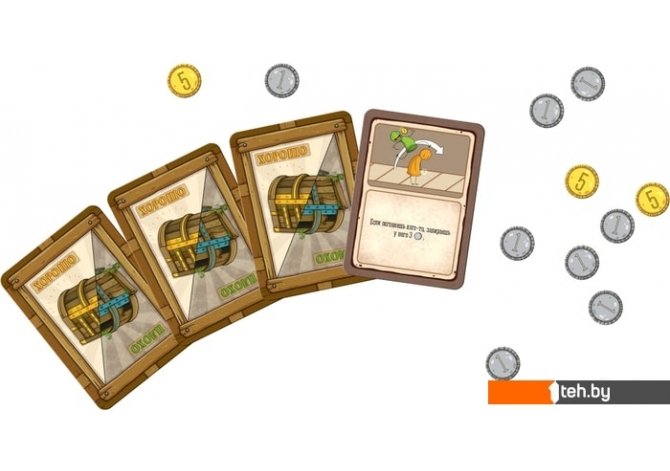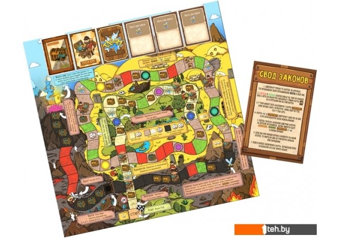 | Комплектация | Игровое поле59 карт90 жетонов монет5 персонажей5 подставок под персонажей2 кубикаСвод законов |