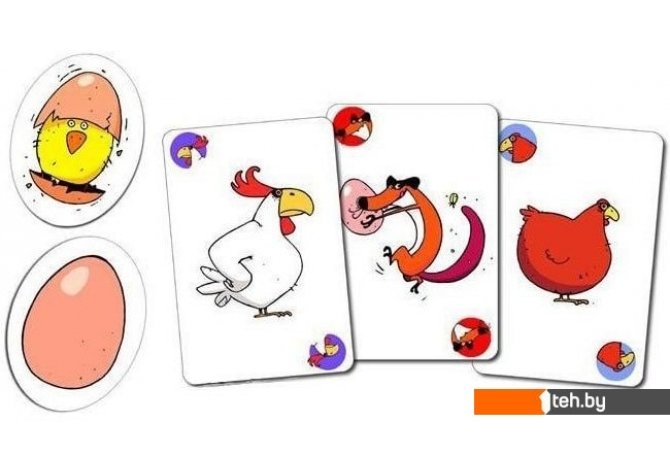 | Информация | Игрокам раздаётся по 4 карты из колоды, карты яйца-цыплёнка не раздаются и в колоде не используются. Сбрасывая и передавая карты соперникам необходимо собирать комбинации карт ("курица", "петух", "гнездо" и др.) позволяющие получать карту "яйцо" и далее вывести цыплёнка (перевернуть карту "яйцо"). Карты "лисица" позволяют забирать карты "яйцо" у соперников, карты "петух" (2 штуки) позволяют защититься от карты "лисица". Для победы необходимо вывести три цыплёнка. Игра развивает логическое мышление и внимательность. |