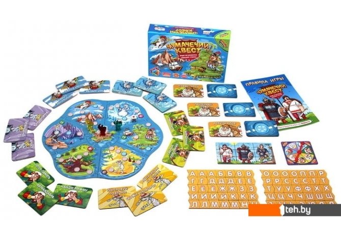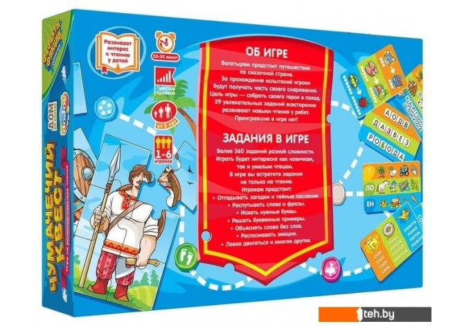 | Комплектация | - Игровое поле.- 3 игровые фигурки богатырей.- 120 карточек с заданиями.- 70 пазликов с буквами.- Игровой барабан со стрелкой.- 2 пакетика для карточек.- 1 игровой кубик.- Правила игры. |
