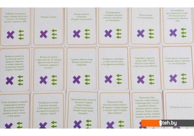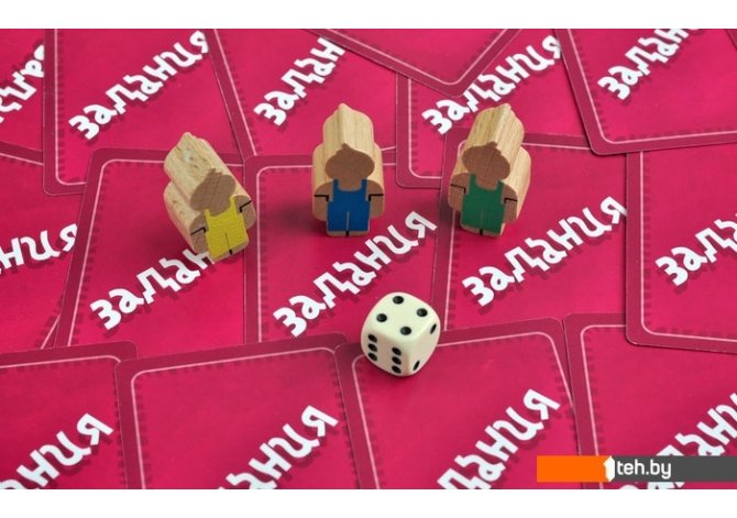| Комплектация | — Поле для игры, по которому вы будете идти к финишу.— 100 карточек с необычными заданиями.— 6 фишек игроков.— Шестигранный кубик.— Правила |