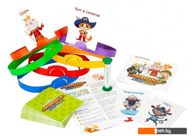 | Комплектация | 61 игровые карточки, энциклопедия сказочный персонажей, существ и предметов - 1 шт. разноцветные ободки - 6 шт. правила игры - 1 шт. песочные часики - 1 шт. |