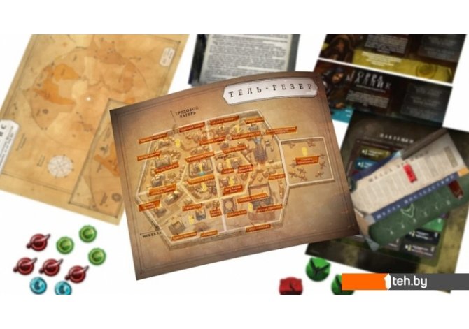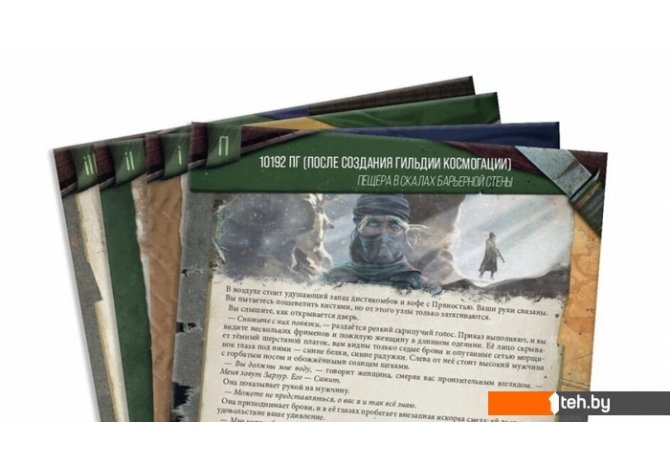 | Комплектация | • 96 карт встреч • введение пролога • введения глав (3 шт.) • маркер последствий • маркер времени • игровое поле • 5 жетонов последствий • 27 жетонов • лист с наклейками навыков • 4 планшета персонажей • карта Дюны • карта Тель-Гезера • правила |