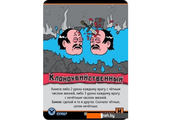 | Комплектация | - 178 карт заклинаний, сокровищ и дохлых колдунов - 8 планшетов героев - 7 медалей недобитых колдунов - 6 черепушек и 6 кровометров - 4 шестигранных кубика - 1 замок Спрутобойни - Правила игры |