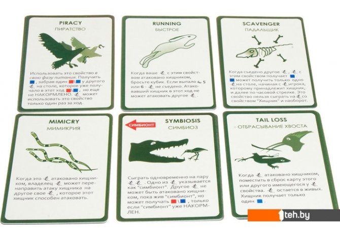 | Комплектация | Колода карт животных или свойств (для игры на большую компанию вам понадобится две колоды, то есть две коробки игры), фишки жира, основной и дополнительной кормовой базы, кубики и правила на русском языке. |