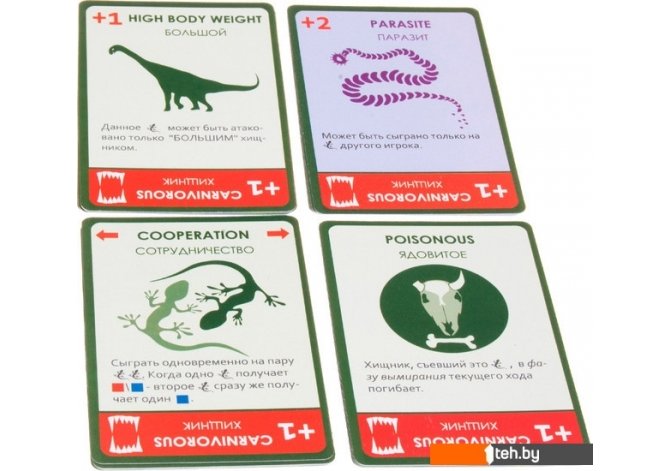 | Информация | «Эволюция» — это игра про разные виды, которые вам предстоит развивать в процессе естественного отбора. Каждый вид представлен в игре одним животным. Как в стратегических настольных играх игроки «апгрейдят» здания или обвешивают армии оружием, амуницией и улучшениями, так и здесь вам предстоит улучшать существ. Чем приспособленнее ваши виды к жизни в суровых условиях конкуренции и ограниченной кормовой базы – тем больше очков вы получите в конце игры. Победителем становится игрок, получивший в конце игры наибольшее количество очков. Очки игрок получает за всех своих выживших животных и обретенные ими свойства. |