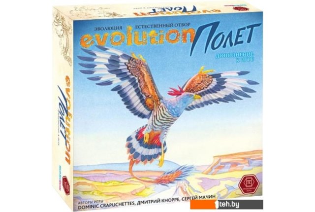 | Информация | «Полет» — дополнение к настольной игре «Эволюция. Естественный отбор» (Evolution), добавляющее летающих существ в экосистему. Созданные вами виды смогут пикировать на ничего не подозревающую жертву, улетать от хищников и перемещаться на новые территории при истощении запасов пищи! |