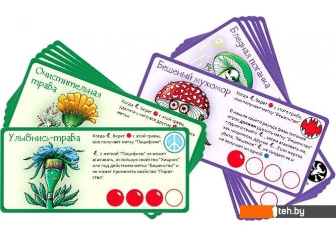 | Комплектация | 24 карты травы и грибов32 метки последствий27 фишек еды2 пустых карты травы и грибовправила |