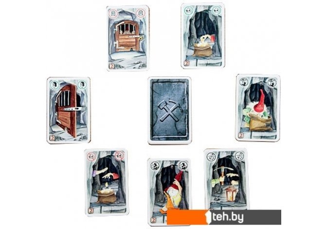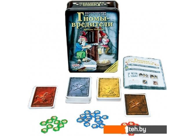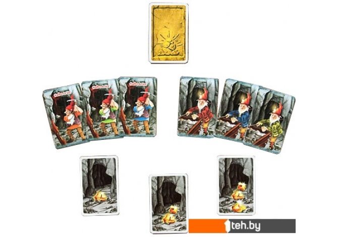 | Комплектация | 110 карт базовой игры: 44 карты туннелей,27 карт действия, 28 карт золотых самородков, 7 карт гномов Золотоискателей, 4 карты гномов Вредителей; 66 карт дополнения: 30 карт туннелей, 21 карта действия, 15 карт гномов (4 зелёных и 4 синих Золотоискателя, 1 Босс, 2 Геолога, 1 Делец и 3 Вредителя), 32 шестигранных жетона золота (ценностью 1, 2, 5), правила игры на русском языке, жестяная коробка. |