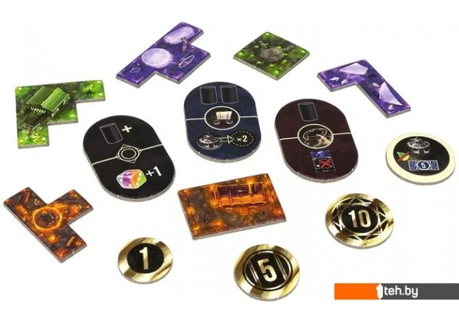 | Комплектация | - Игровое поле- 4 планшета игроков- 110 карт- 68 жетонов- 84 фрагмента лагеря- 19 кубиков- 48 самоцветов- 47 деревянных фишек- Правила игры |