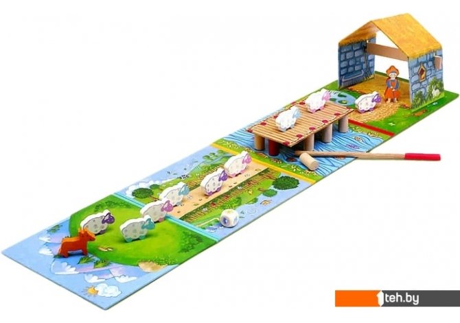 | Комплектация | - 1 набор из 4 декорированных игровых площадок- 1 овчарню и ее деревянную балку- 1 мост- 10 деревянных деталей (опоры моста)- 1 деревянную палочку- 1 пастушку- 9 овечек- 1 собачку- 1 кубик |