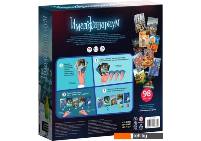 | Информация | В этой удивительной игре победа достигается не ловкостью рук и везением, а проницательностью и глубиной воображения. Вам предстоит придумать ассоциации к картинам и отгадывать то, что задумали другие игроки. Каждая партия "Имаджинариума" окажется уникальной и неповторимой, как облако. Или как снежинка. Зовите друзей и погружайтесь в волшебную атмосферу игры! |