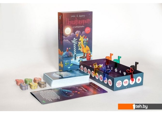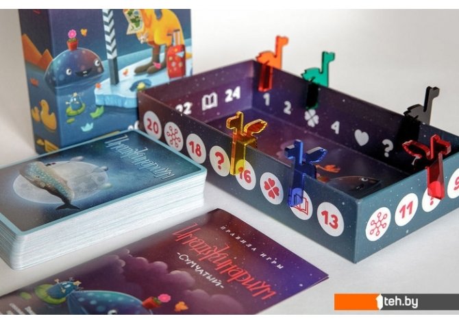 | Комплектация | Коробка-поле, играть надо прямо на нейКарточки с ассоциациями — 64 штукиФишки жирафов — 6 шт (жирафы не сумчатые)Жетоны для голосований — 36 шт. (по 6 на игрока)Правила игрыЛистовка с иллюстраторами |