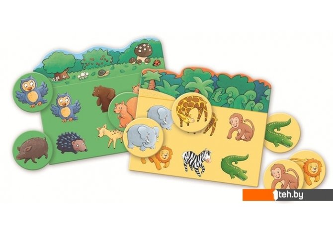 | Комплектация | 5 игровых полей и 30 фишек с изображениями различных животных. |