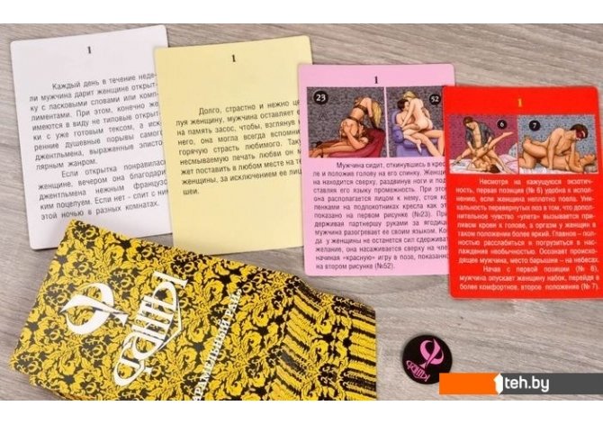 | Комплектация | В яркой, привлекательной коробке вас ждут умопомрачительные задания, новые секс-позиции и даже настоящие сценарии для ролевых игр. Всё это представлено на 48 красочных, со вкусом оформленных карточках-фантах. |