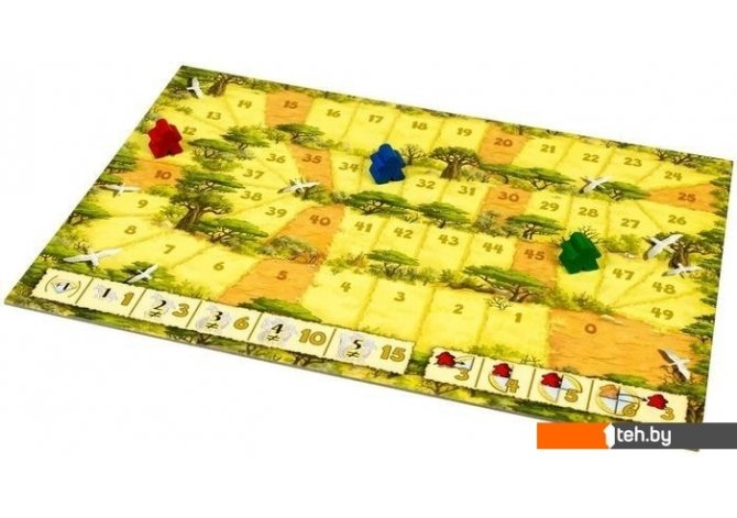 | Комплектация | 72 квадрата местности Стартовое поле 50 жетонов животных 5 фишек слонов 30 фишек фотоохотников 2 фишки внедорожников 5 жетонов 50/100 Дорожка подсчёта очков Правила игры |