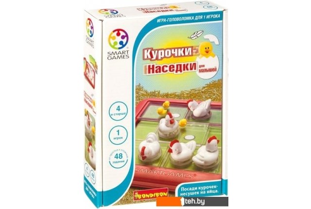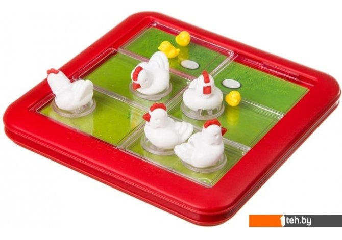 | Информация | «Курочки-наседки» – это игра-головоломка со скользящими по игровому полю деталями. Вы должны перемещать детали головоломки по кругу до тех пор, пока все яйца не окажутся под курочками-наседками! Эта версия «для малышей» содержит 48 заданий разных уровней сложности и 3D фигурки курочек и цыплят. Игра содержит: игровое поле с отсеком для хранения 48 карточек с заданиями, 5 прозрачных деталей головоломки с курочками и цыплятами, листовка с решениями. Игра предназначена для одного игрока в возрасте от 4 лет. |