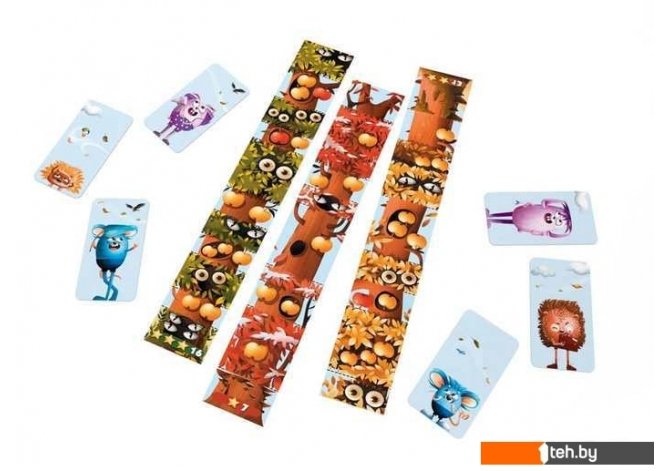 | Комплектация | 3 двусторонних дерева-линейки; 72 карты с зайчиками, ёжиками и мышками; 15 кристалликов красных яблок ; 35 кристалликов жёлтых яблок; 2 буклета с правилами игры |