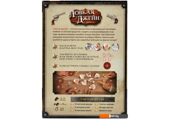 | Информация | - Представляем вам настольную игру "Ловкая Джейн" - идеальное развлечение для любителей реакции и скорости. - Следите за картами и быстро выполняйте жесты, чтобы победить своих соперников. - Возможно, именно вам удастся стать самой быстрой рукой на Диком Западе и заработать максимум очков славы! |