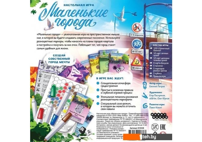 | Информация | "Маленькие города" – увлекательная игра на пространственное мышление, в которой вы будете создавать современные поселения. Используйте разноцветные маркеры, чтобы наносить на планы городов кварталы и постройки и получать за них очки. Побеждает тот, чей город станет самым удобным для жизни. В игре вас ждут: Созидательная атмосфера градостроения Простые в освоении правила и глубокий игровой процесс Уникальная механика рисования разноцветными маркерами Специальный соло-режим, в котором вы можете отточить свои навыки |
