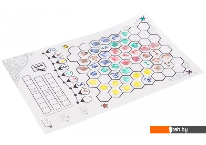 | Комплектация | 100-страничный блокнот 10 карт личных целей 10 карт дополнительных целей 4 карты бонусов 5 памяток 5 маркеров разных цветов 2 кубика Правила игры |