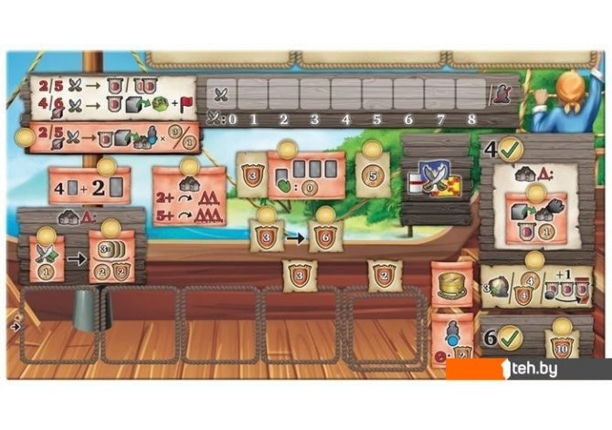 | Комплектация | Игровое поле 4 планшета кораблей 265 карт: 157 карт путешествия 77 карт сюжета 8 карт достижений 8 карт грандиозных сооружений 15 карт Автомы (для режима одиночной игры) 171 жетон: 58 жетонов дублонов 24 жетона зданий 13 жетонов городов 4 жетона сюжета 23 жетона наследия 20 жетонов атрибутов 25 жетонов сражения 4 жетона победных очков 40 деревянных фигурок: 32 фигурки матросов 4 фигурки кораблей 4 фигурки исследователей 163 деревянные фишки: 12 фишек влияния 4 фишки победных очков 12 фишек уровней 96 круглых фишек 39 фишек контроля 4 планшета-памятки Правила игры |