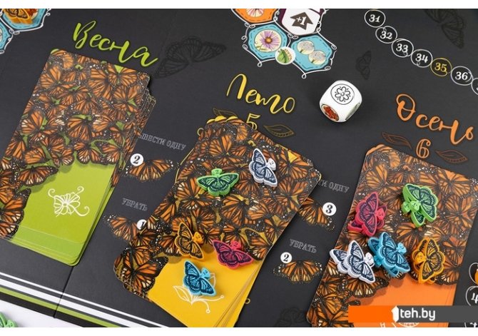 | Комплектация | • Поле миграции и поле жизненного цикла • 50 деревянных фишек бабочек (по 10 бабочек каждого цвета) • 120 жетонов цветков • 20 карт целей сезона • 16 жетонов заповедников • 36 карт полёта • 15 карт ускорения • 6 жетонов достижений • 5 маркеров подсчета очков • 1 кубик цветков • Правила игры |