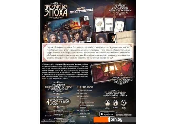 | Информация | 1900 год, Париж. Дивный новый мир: открытие метро, Всемирная выставка, выступления суфражисток, летние Олимпийские игры – жизнь в столице Франции бурлит! Однако молодой журналист Виктор Лавель больше интересуется не всеми этими событиями прекрасной эпохи, а мрачными убийствами, таинственными похищениями и другими правонарушениями.Новая игра серии "Место преступления" сочетает в себе знакомые механики базовой игры и шарм, присущий Парижу начала двадцатого века.Примерьте на себя роль детектива, которому предстоит исследовать места преступлений, встречаться со знаменитыми учёными и распутывать загадки, оставленные для вас преступниками. Цель – отыскать злоумышленника, пока не истекло время!Об игре"Место преступления: Прекрасная эпоха" – это логическая настольная игра, являющаяся второй частью новой серии "Тысячелетие", которая повествует историю древнего рода Лавель из Парижа. Представители этой династии всегда славились своими особыми детективными навыками и сюжет этих игр связывает в единую эпопею приключения этих героев из разных эпох."Прекрасная эпоха" продолжает линейку знаменитых кооперативных детективов "Место преступления", но не в формате дополнения, а как самостоятельная игра. Действия игры разворачиваются в Париже в 1900 году. Вы берёте на себя роль журналиста по имени Виктор Лавель, у которого тяга к расследованиям преступлений.Игрокам предоставляется четыре сценария в стиле ар-нуво, которые повествуют уникальные истории расследований. Игра кооперативная, и все игроки действуют сообща, чтобы раскрыть преступление.Как играть?"Место преступления" – это детективная игра с уникальным игровым процессом. Кроме поля, карт и планшетов в игре активно используется стороннее приложение для гаджетов. Оно будет вести вас по сюжету и взаимодействовать с QR-кодами. Сканирование локаций перемещает вас по городу, а контакт с картами персонажей начинает диалог, где можно провести допрос свидетеля о других людях или найденных вещественных доказательствах. Другой особенностью приложения является возможность в режиме альтернативной реальности искать улики. Это можно сделать в специальных очках (в состав игры не входят) или при помощи панорамного вида – на ограниченное время экран телефона меняет ваше окружение и переносит вас на место преступления. Если расследование зашло в тупик, вы можете обратиться за помощью к коллеге Шарлотте, ведущей колонки "Загадки и тайны" в вашей газете. У нее всегда есть подсказки к тайне, которую вы пытаетесь разгадать.Обратите внимание, что на расследование отведено ограниченное количество игрового времени, которое тратится во время взаимодействий с картами персонажей и планшетами локаций. Кто победил?Когда вы собрали достаточно информации и смогли докопаться до истины, вы можете раскрыть дело. Поскольку вы журналист и не можете арестовывать подозреваемых, то вы напишете статью о ваших находках, которые помогут полиции и заодно улучшат продажи газеты. Вам предстоит дать ответы на несколько вопросов о составе преступления. Успех вашей команды определяется выводами вашего расследования. Если вы недовольны результатом или вы считаете, что могли что-то упустить, то всегда можно пройти сценарий ещё раз.Не верьте совпадениям, будьте бдительны и внимательны к деталям, ведь ист