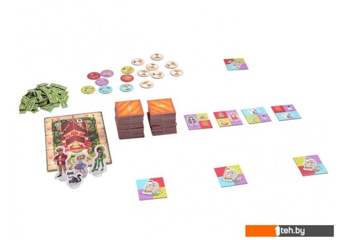 | Комплектация | 64 карточки с игрушками; 4 стартовые карточки с кассой; 60 жетонов денег номиналом 10 монет; 16 жетонов наград: 4 награды за разнообразие игрушек; 4 награды за большинство одинаковых игрушек; 8 запасных наград; 7 фишек игроков; 7 пластиковых подставок для фишек; 1 счётчик монет; правила игры; |