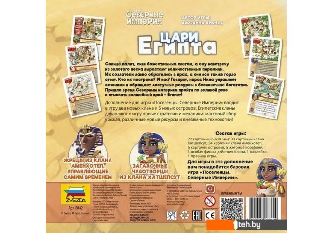 Фотографии, описание и технические характеристики модели настольной игры Звезда Поселенцы. Северные империи. Цари Египта (дополнение) взяты из открытых источников, официального сайта производителя или представительства Звезда в Республике Беларусь.