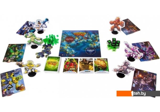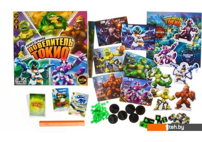 | Комплектация | - Поле Токио- 66 карт- 28 фишек-счётчиков- 8 шестигранных кубиков- 6 полей монстров- 6 картонных фигурок монстров- 6 пластиковых подставок под них- 50 кубиков энергии- Правила игры |
