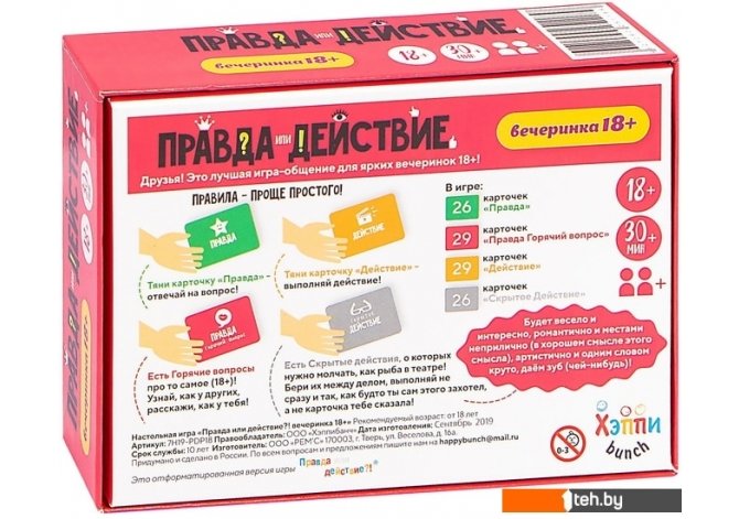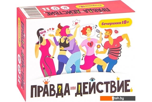 | Информация | "Правда или Действие" - это лучшая игра-общение для ярких вечеринок 18+!Правила игры очень просты. Тяните карточку "Правда" - отвечайте на вопрос! Тяните карточку "Действие" - выполняйте действие!Есть Горячие вопросы про то самое (18+)! Узнайте, как у других, расскажите, как у вас! Есть Скрытые действия, о которых нужно молчать, как рыба в театре! Берите их между делом, выполняйте не сразу и так, как будто вы сами этого захотели, а не карточка вам сказала!Будет весело и интересно, романтично и местами неприлично (в хорошем смысле этого смысла), артистично и одним словом круто, даем зуб (чей-нибудь)! |