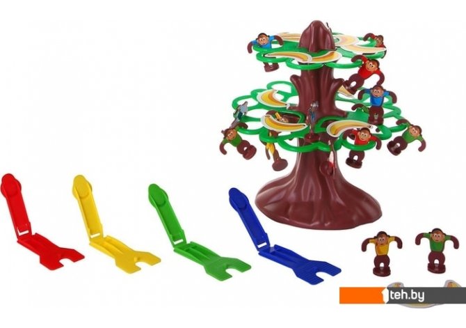 Комплектация | дерево, большой круг листвы, малый круг листвы, 16 обезьянок, 16 бананов, 4 катапульты, наклейки, правила игры. |