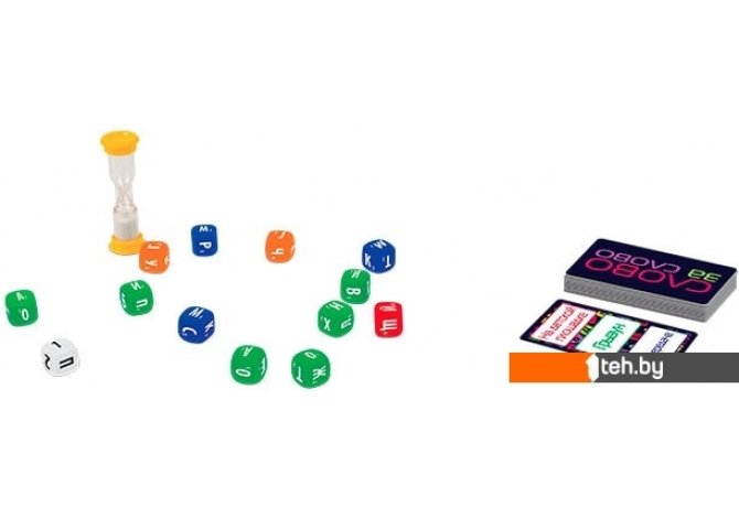| Комплектация | Специальные кубики с буквами – 13 шт.Песочные часы – 1 шт.Карточки тем – 56 шт. |
