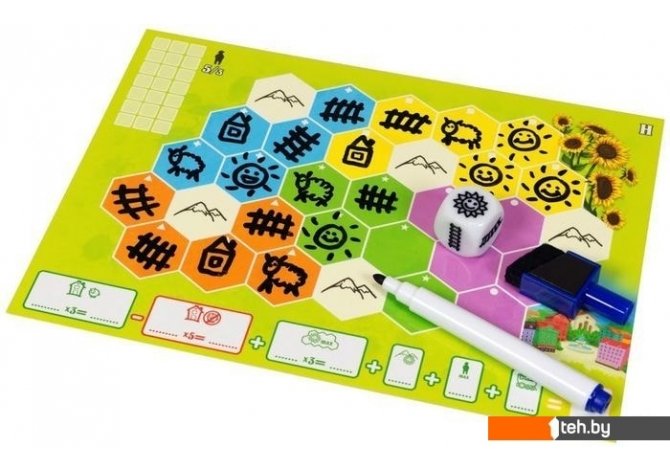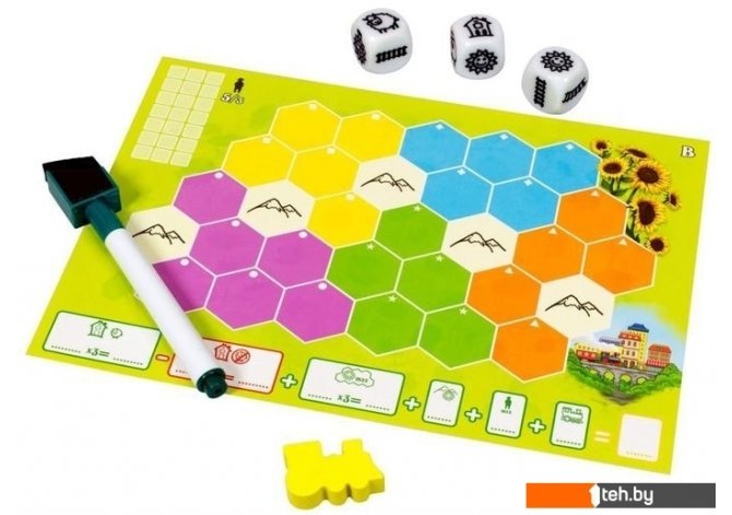 | Информация | "Солнечная долина" – это креативная настольная стратегия, в которой каждый игрок будет создавать живописную горную долину. На равнинах появятся уютные домики, луга заполнят стада кучерявых овец, подножия гор украсят поля подсолнухов, а железные дороги сделают этот край удобным для жизни.Бросьте кубики. Каждый по очереди выбирает 1 кубик.Нарисуйте на листе символ с выбранного кубика.Получите победные очки за жителей, железные дороги, поселения с пастбищами и подсолнечные поля.Игра для всех возрастов: простые правила и богатый игровой процесс.Большая вариативность: 6 видов стартовых расстановок. |