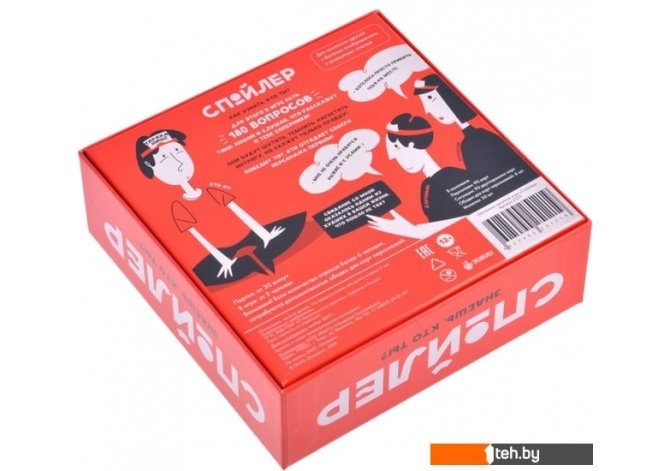 | Информация | Знаете игры с карточками на лбу? Забудьте их немедленно! В "Спойлере" вам не придется вымучивать вопросы, они уже входят в комплект: сразу 180 штук! Ни на один из них нельзя ответить односложно. Придется подключать воображение и жизненный опыт! |