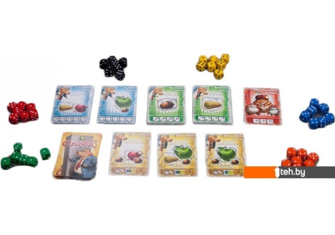 | Комплектация | - 42 кубика (по 7 штук шести цветов)- 83 карты припасов- Правила игры |