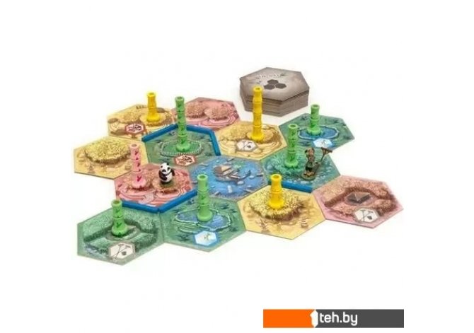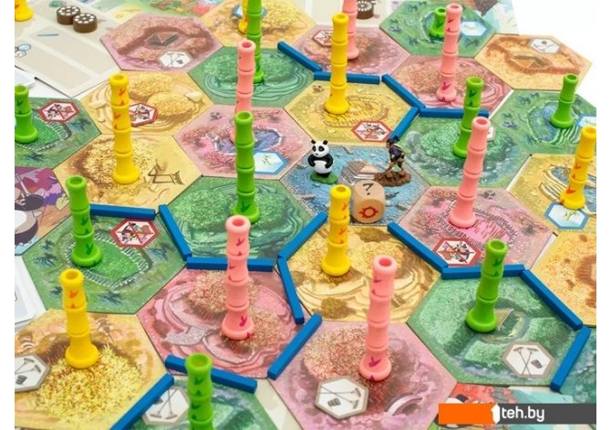 | Комплектация | 28 участков земли, 90 сегментов бамбука: 36 - зеленого, 30 – желтого и 24 – розового, 20 оросительных каналов, 9 улучшений, 46 карт заданий, 4 персональных поля, 8 жетонов действия, 1 погодный кубик, 1 фигурка Панды 1 фигурка садовника, правила игры |