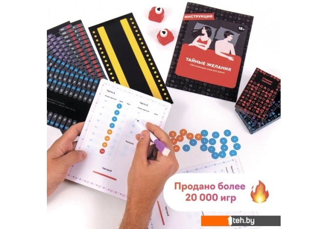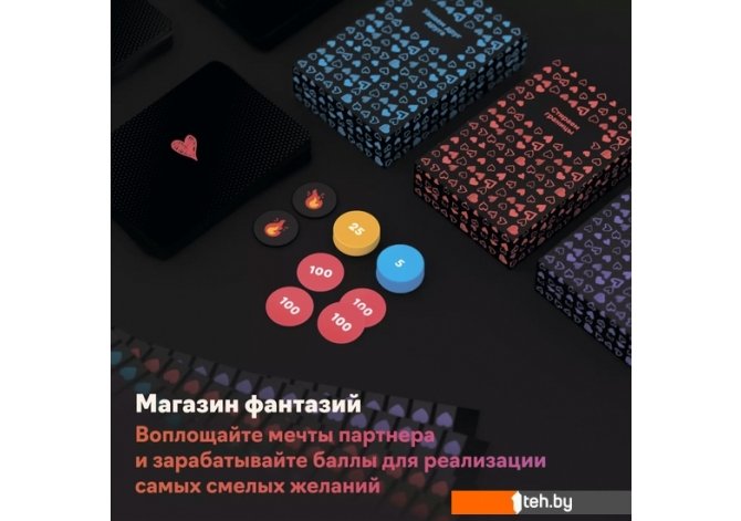 | Комплектация | 120 карточек с разными уровнями откровенных желаний Пенал для выявления общих фантазий. Он покажет только те желания, которые выбрали оба партнера. Сигнал настроения — вам больше не нужно намекать, сигнал сообщит партнеру о вашем желании. Магазин фантазий — воплощайте мечты партнера и зарабатывайте баллы для реализации самых смелых желаний. |